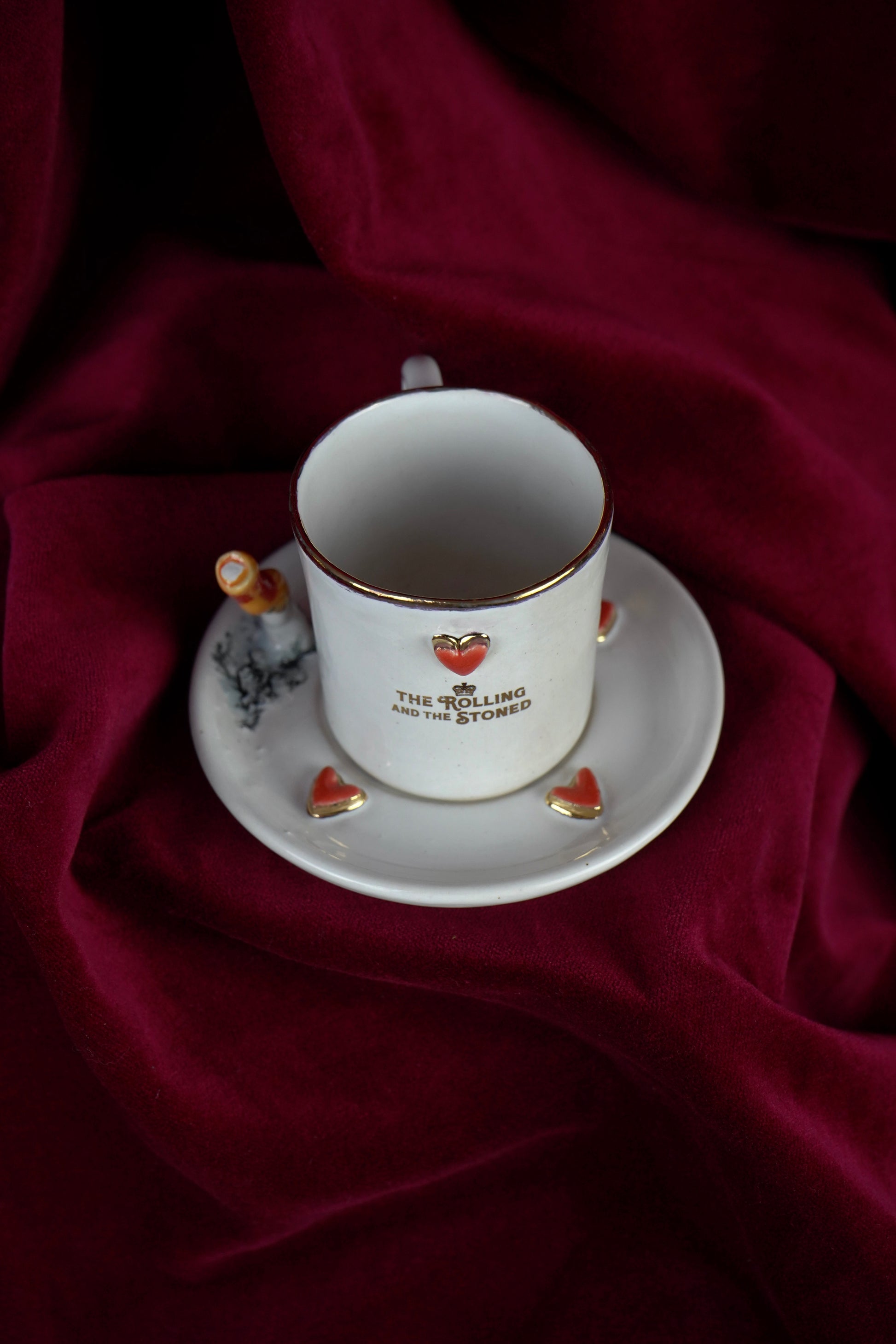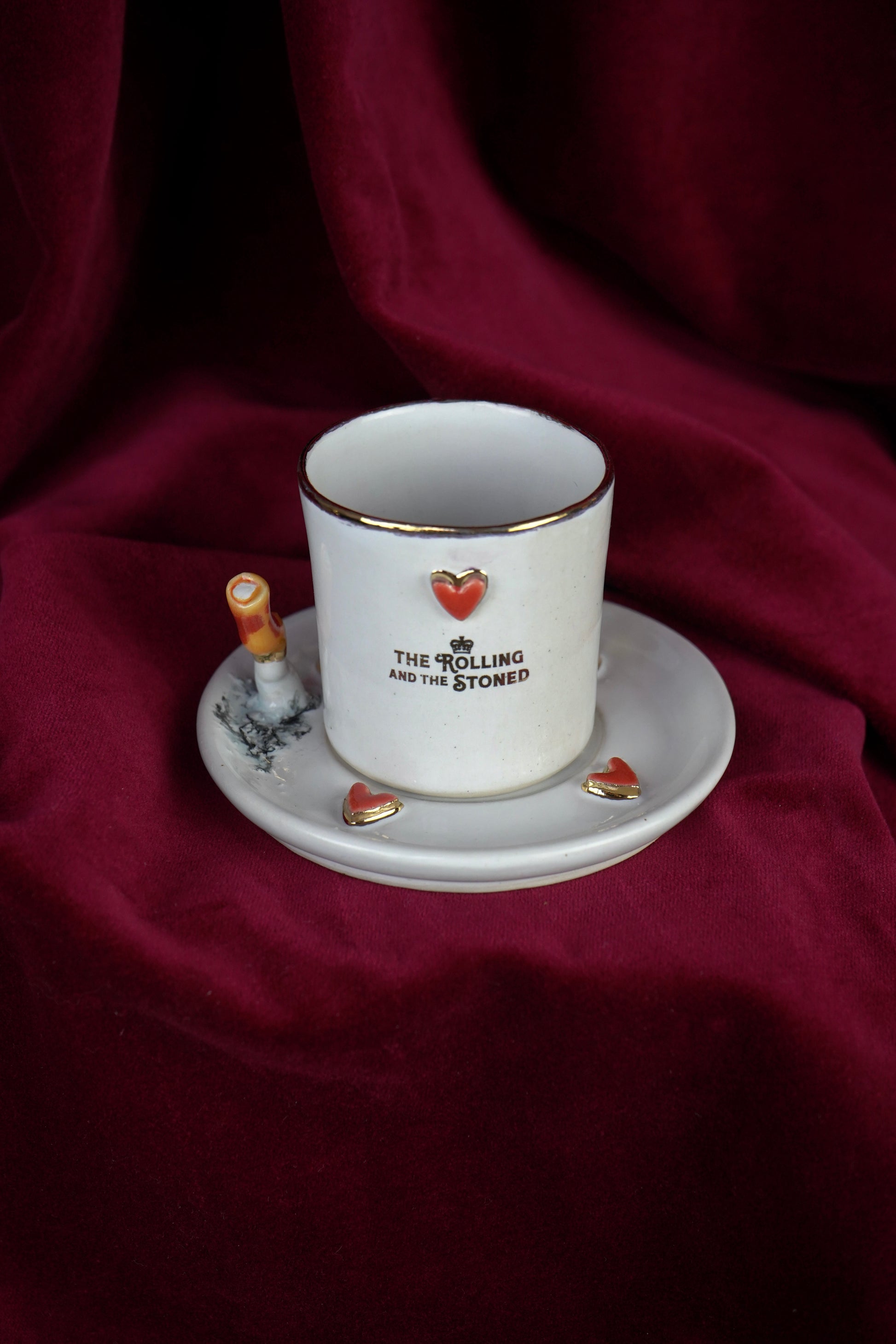 At its heart (literally), a hand-painted red heart edged in 24 karat gold lustre sits proudly on the cup, facing outward, a quiet signal meant for the person across the table. Four matching hearts are scattered across the saucer like intimate declarations. The handle is placed at the back, finished with a red heart and 24 karat gold logo, so the love is always directed toward your lover - a subtle, deliberate gesture designed for moments meant to be shared.